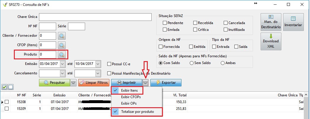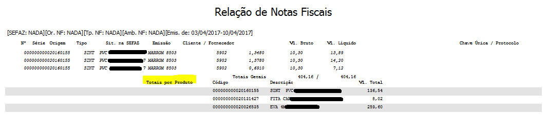 Em virtude de alterações na legislação do estado de Santa Catarina, muitos usuários tiveram de incluir os insumos nas notas fiscais de cobrança (x.124). Com isso, os dados da pesquisa para verificar os valores de cobrança ficaram prejudicados. Para atender à solicitação de nossos clientes, foram incluídos filtros adicionais nesta consulta. Agora é possível filtrar por produto e também incluir a totalização por produto. Para exibir os "Totais por Produto" no relatório (Relação de Notas Fiscais), é preciso selecionar para "Exibir Itens" e "Totalizar por produto", conforme abaixo: