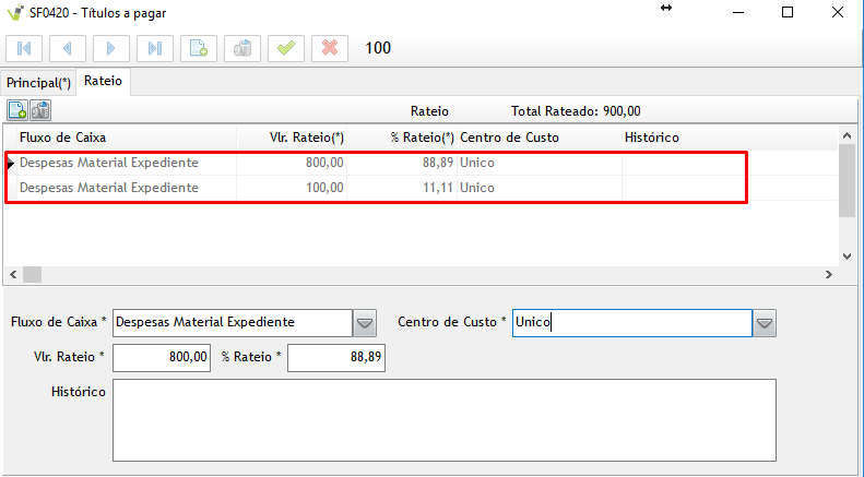 Melhoria nas rotinas da tela SF0420 - Títulos a Pagar, para criticar situações em que o rateio estava incorreto. Foi ajustado também para quando da inclusão de um rateio para um título o sistema calcule o percentual automaticamente.