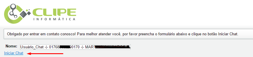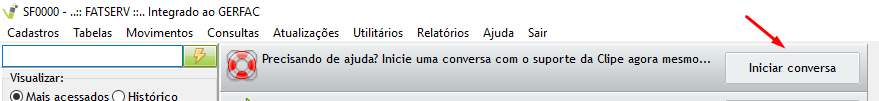 Foi incluído na tela principal do sistema uma mensagem com um botão para acessar o "chat" de Suporte da Clipe. Ao clicar no botão indicado o sistema já vai direcionar para acessar a fila de atendimento através do browser, não necessitando acessar o site da clipe de forma manual. O sistema pede um nome que fica gravado para ser usado nas próximas vezes, mas, que ainda pode ser alterado. Depois de informar o nome o sistema abre a tela do chat com o nome informado, mais o nome da empresa para auxiliar no atendimento.