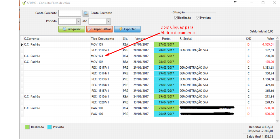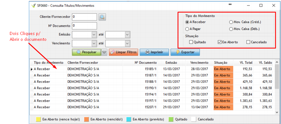 Foi incluída a legenda de identificação da situação dos títulos. Relembramos que os títulos a Receber/Pagar para serem considerados "Quitados" devem receber movimento de pagamento pelas telas de Movimentos (SF0420-Títulos A Pagar / SF0240-Títulos A Receber). Já os Movimentos de Caixa (Créd/Déb) são considerados "Quitados" quando sua data de movimento é igual ou inferior da data atual, sendo os demais considerados "Em Aberto (previsto)".