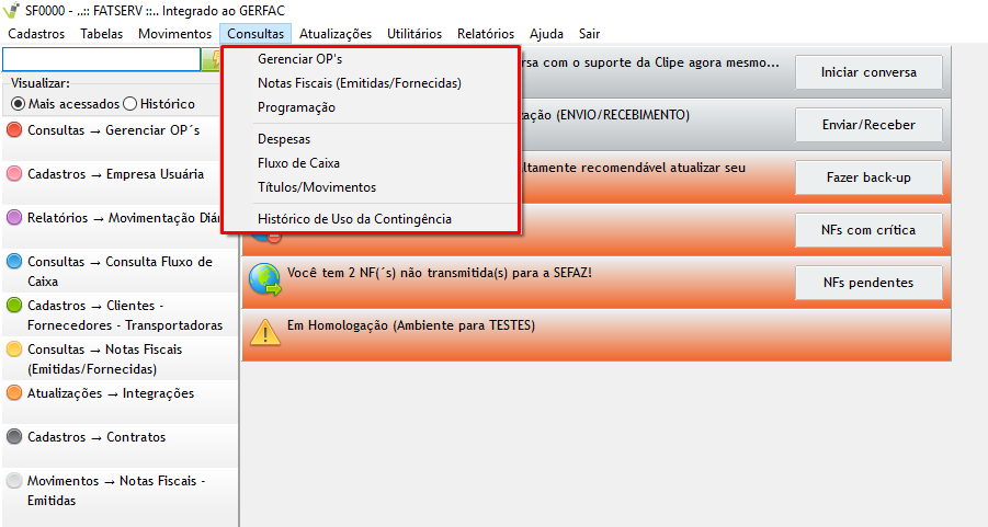 Fique atento!!! Existe uma nova ordenação das opções em todas as opções dos menus suspensos. Agora as opções encontram-se em ordem alfabética e separadas por um travessão quando se tratarem de módulos ou áreas diferentes do sistema. Esta adequação foi necessária para preparar o sistema para conter novas funcionalidade e módulos.