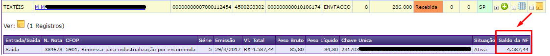 Foi incluído o campo "Saldo da NF" para demonstrar o saldo restante na nota fiscal de remessa. Este campo foi incluído a nível de sub-consulta nas seguintes telas: