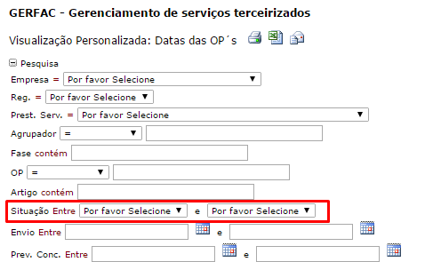 Foram incluídos filtros de Situação da OP para que possa informar uma faixa de situações em que se deseja visualizar os dados. A situação inicial e final devem ser compatíveis, ou seja, situação inicial sempre deve ser menor ou igual a situação final, do contrário a consulta não retornará dados. O filtro foi incluído nas seguintes consultas: