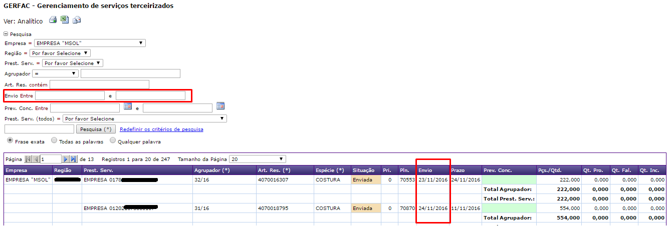 Foi incluído na consulta de OP's Não Encerradas --> Analítico o filtro de datas de Envio, conforme destacado abaixo: