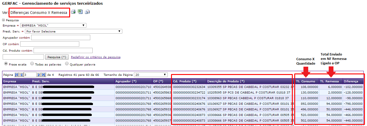 Foi criada uma nova consulta "Diferenças Consumo X Remessa" (GF0090) para ter um controle mais efetivo no envio de materiais para aquelas empresas que trabalham com cálculo de consumo nas notas fiscais de retorno dos prestadores de serviço. Dessa forma, ficará evidente os materiais aonde ainda há necessidade de envio para que o prestador de serviço possa gerar o retorno total da industrialização.
