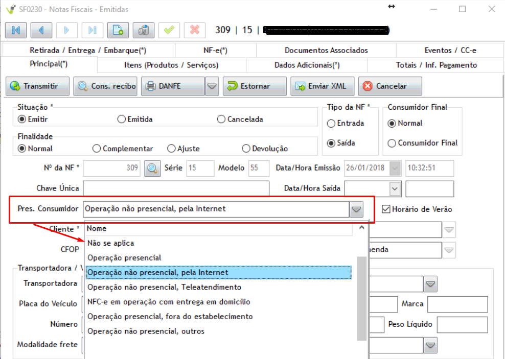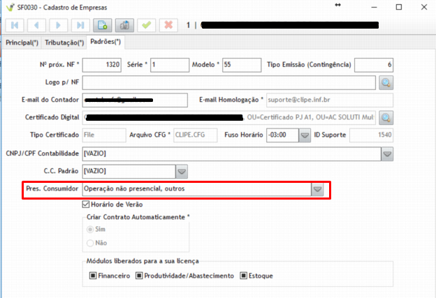 Na atualização da versão este campo receberá o valor padrão 9 (Operação não presencial, outros). É importante que você confirme qual a opção que melhor se aplica no caso de sua empresa. Caso deseje alterar a opção padrão, pode fazer isso no cadastro de Empresas. Quando da geração da Nota Fiscal o sistema vai colocar a opção padrão e, caso seja necessário, você ainda poderá alterar essa informação antes de transmitir a Nota Fiscal.