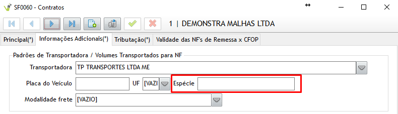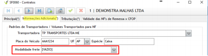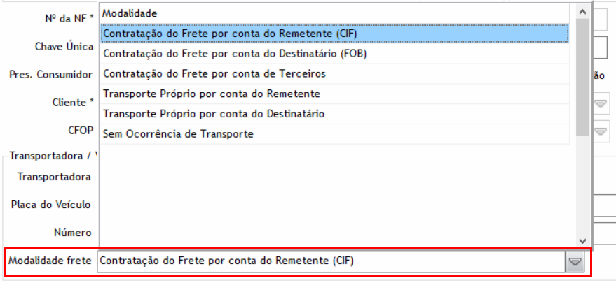 Para comportar as novas modalidades de frete o tipo do campo foi alterado para uma lista de seleção tanto no cadastro de Contratos como na tela de Notas Fiscais Emitidas. Os dados serão gravados conforme os códigos fornecidos no manual da SEFAZ. Os dados já existentes serão convertidos na atualização da versão.