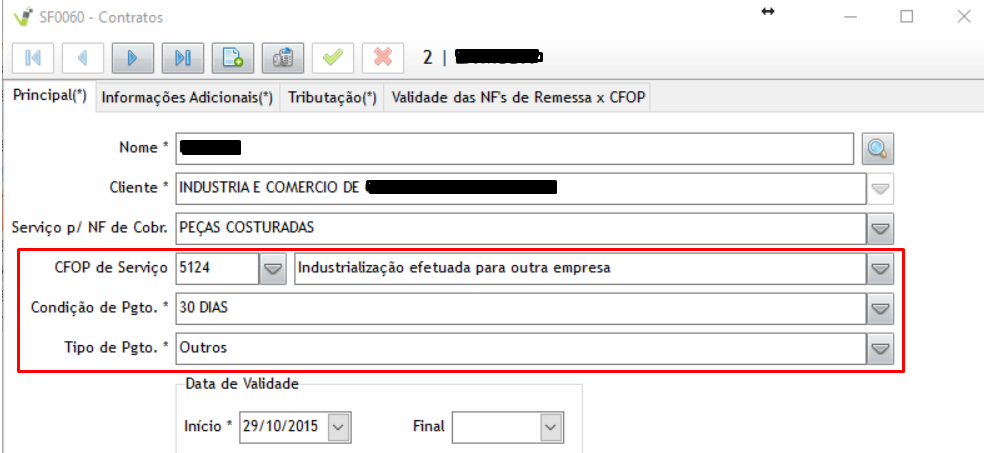 No cadastro de Contratos foi criado o campo de Tipo (forma) de Pagamento padrão para atender a exigência. Outros campos foram movidos da aba Dados adicionais para a aba Principal a fim de dar mais clareza a tela. Destacamos abaixo os campos que foram realocados nas abas: