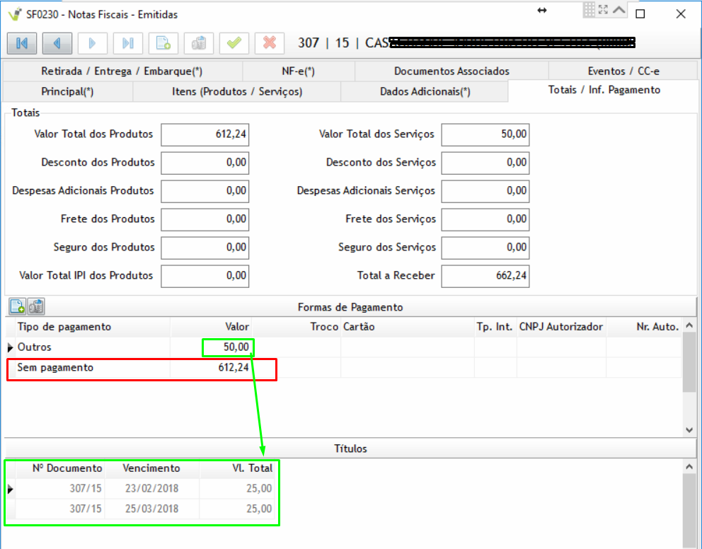 IMPORTANTE: Caso um ou mais itens do pedido não gerem cobrança, será gerado um registro com o valor da diferença e o tipo de pagamento 90 (sem pagamento). Esse será o caso, por exemplo das notas de retorno e cobrança juntos. Veja como fica abaixo para um caso de uma NF no valor total de R$ 662,24, mas somente R$ 50,00 é de cobrança, em 2 parcelas: