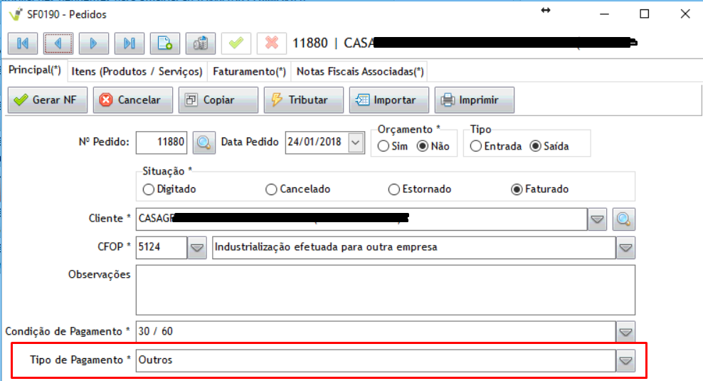 Na tela de Pedidos foi adicionado também o campo Tipo de Pagamento. Ele será preenchido automaticamente conforme já é preenchido o campo de Condição de Pagamento.