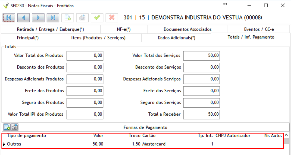 Na tela de Notas Fiscais Emitidas o campo também foi adicionado, junto com outros campos necessários para atender a legislação. Todos os campos (Tipo de Pagamento, Valor, Troco, Cartão, Tp. Int.) podem ser alterados de acordo com a necessidade antes da transmissão da Nota Fiscal. Na geração da Nota Fiscal já serão criados os dados necessários para envio no XML e os dados são checados pela SEFAZ, que retorna crítica caso algum dos dados esteja incorreto.