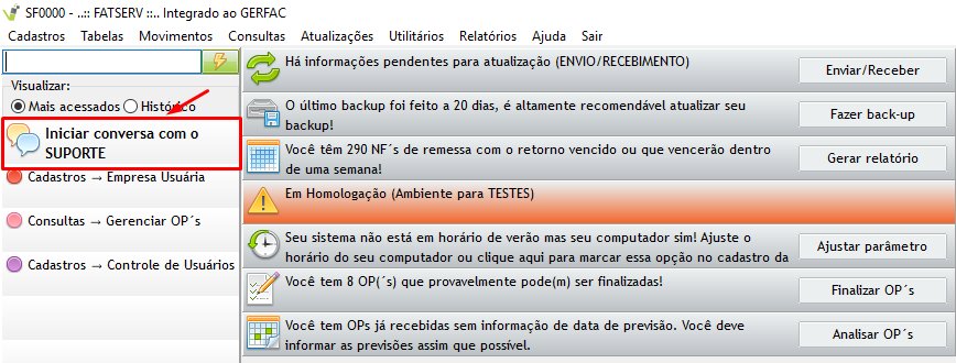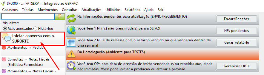 Através do sistema FATSERV você pode falar diretamente com o suporte, por clicar na área destacada "Iniciar conversa com o SUPORTE":