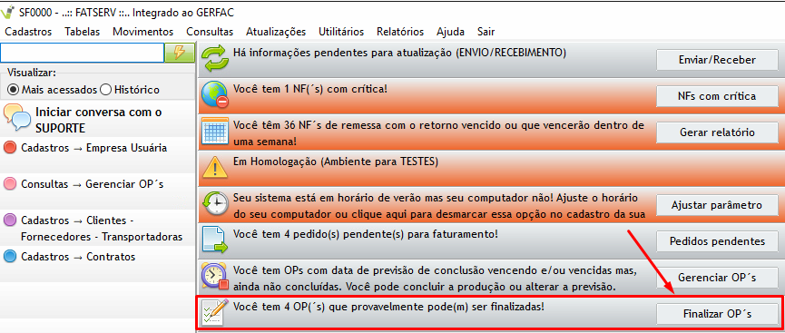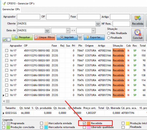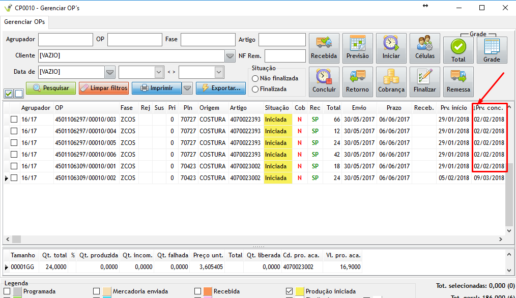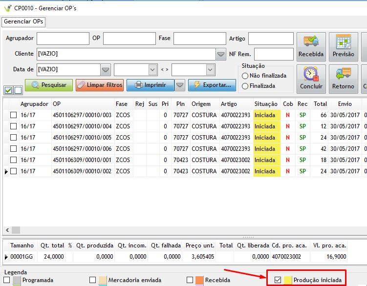 A tela de Gerenciar OPs agora possui 4 totalizadores, sendo que os valores fora dos parêntesis são QUANTIDADES e os destacados entre parêntesis são de NÚMERO DE OPs.
