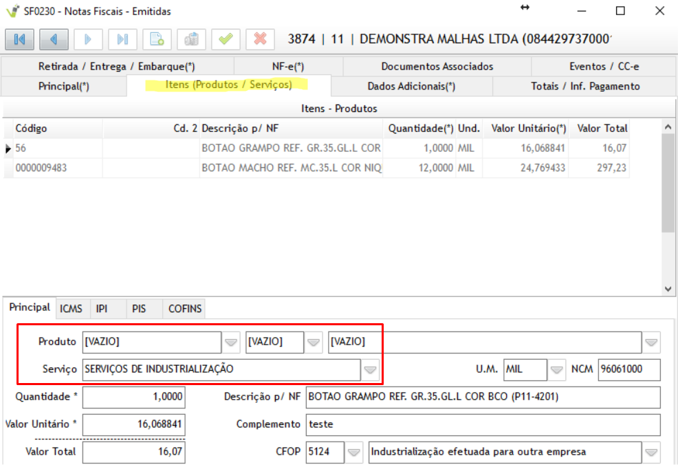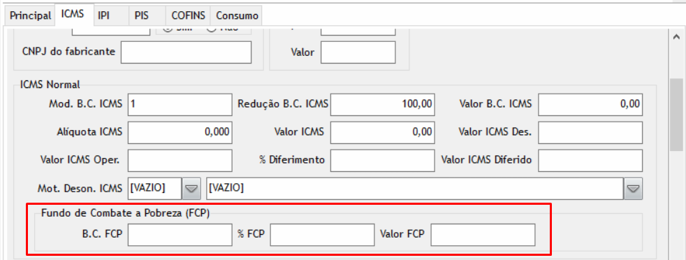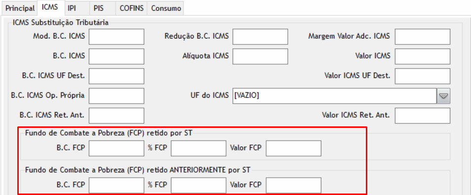 Para as situações de Substituição Tributária com informações referentes ao Fundo de Combate à Pobreza, deve-se informar os dados na aba ICMS dos Itens Produtos/Serviços conforme a necessidade. Os campos criados foram:
