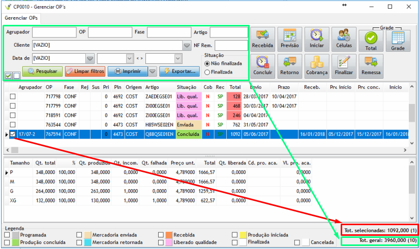 Um deles mostra o total de "QTD (OPs)" selecionadas pelo usuário (destaque em vermelho). Já o outro mostra a "QTD (OPs)" geral que está sendo exibido na tela de acordo com os fitros selecionados no cabeçalho (destaque em verde).