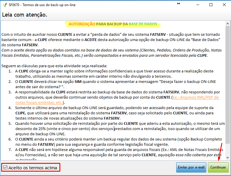 Foi criada uma opção de fazer back-up em nuvem (servidores disponibilizados pela Clipe). Na atualização da versão, caso o cliente concorde com os termos na atualização de versão, ele deve manter marcado o campo "Aceito os termos acima" e clicar em "Continuar", dessa forma o sistema vai perguntar a cada vez que for encerrado se o usuário deseja fazer um backup da base de dados.