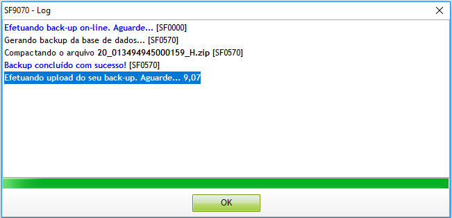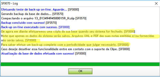 Ao concordar com os termos, na atualização o sistema vai marcar na base que o backup ON-LINE pode ser feito e dará as mensagens abaixo: