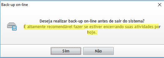 A cada encerramento do sistema FATSERV será feito a pergunta abaixo, indicando a opção do backup ON-LINE.