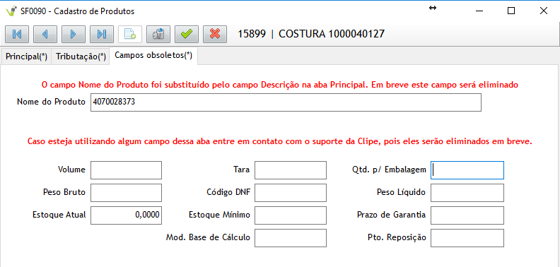 Caso esteja utilizando algum dos campos da aba "Campos Obsoletos", você deve entrar em contato com o suporte da Clipe para verificar essa utilização, pois numa versão futura estes campos estão previstos para serem eliminados. O campo de "Nome do Produto" apesar de poder conter dados, foi substituído pelo campo "Descrição" na aba principal em todos os seus usos dentro do sistema.