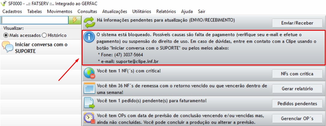 Caso seu sistema não esteja abrindo, você pode falar com o suporte acessando nosso site (www.clipe.inf.br). Clique no link "Suporte On-line":