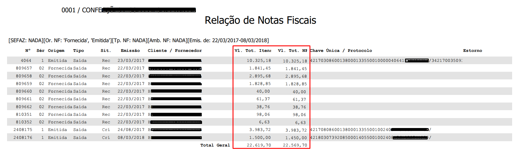 Foi disponibilizado novamente no relatório de Notas Fiscais, o campo que representa o "valor líquido" da nota fiscal. Porém, para alinhar as descrições do sistema com as descrições da DANFE, adotamos o título "Vl. Tot. Itens" para o atual "Vl. Total" e "Vl. Tot. NF" para o que era conhecido como "valor líquido". Dessa forma é possível identificar valores de descontos ou outras despesas adicionadas.