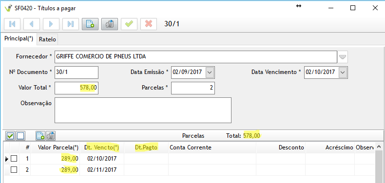Foi atualizado o nome dos campos de data para ficarem mais claros com as iniciais "Dt.". Também foi ajustado a formação dos campos de número documento, datas e valores.