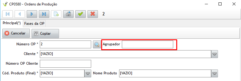 Na tela de Ordens de produção foi incluído o campo "Agrupador" para que se possa identificar as ordens de produção agrupadas quando necessários (Ex. Período de produção "2018-04").