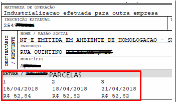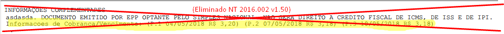 ■Na atualização para a versão 4.0, o FATSERV vai colocar por padrão a forma de pagamento "Outros", mantendo a impressão das parcelas no DANFE na área "Fatura/Parcela" (Acrescentado NT 2016.002 v1.50). Com isso não serão mais colocadas as parcelas na área "Fatura/Duplicata" do DANFE, sendo impressas nas "Informações Complementares", conforme abaixo (Eliminado NT 2016.002 v1.50):