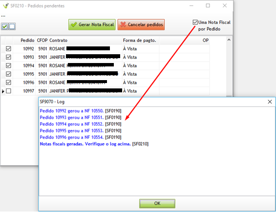 Depois clique em "Gerar Nota Fiscal". O sistema irá gerar uma nota fiscais para cada pedido selecionado: