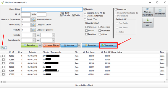 Depois de geradas as notas fiscais, você clicar em "NFs pendentes" ou pode abrir a "Consulta de NF's", selecionar as notas a transmitir ou todas, e clicar em "Transmitir":