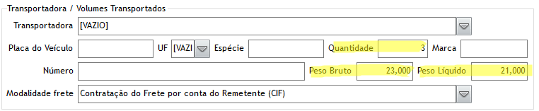 Na tela de pedidos foram criados novos campos para informar dados dos Volumes Transportados (Quantidade Volumes, Peso Bruto, Peso Líquido). Uma vez informados no pedido, o sistema irá somar os valores de todos os pedidos gerados na mesma nota fiscal.