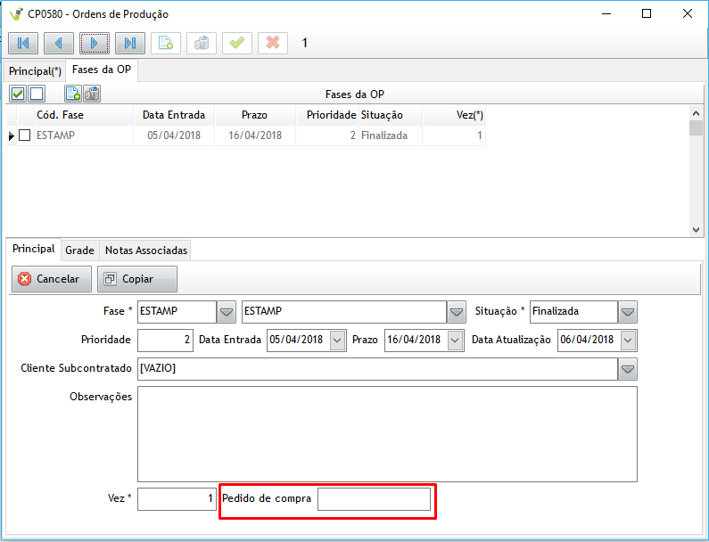 Para clientes que cadastram Ordens de Produção (OP), foi criado o campo "Pedido de Compra" na aba "Fases da OP". Este campo foi incluído também no relatório de romaneio da OP, e foi ajustado o campo "Fase" para aparecer a descrição ao invés do código.
