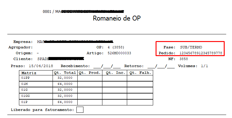 O romaneio foi ajustado para conter os novos campos. Também foi corrigido a ordem de impressão dos tamanhos: