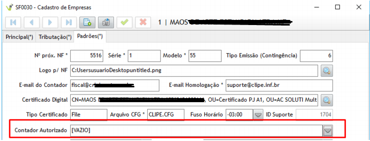 Foi alterado o nome do campo para "Contador Autorizado". Também foi efetuado ajustes para que caso seja cadastrado um CPF e não um CNPJ o sistema envie corretamente a informação para o XML. O contador autorizado deve estar previamente cadastrado como Cliente / Fornecedor. O cadastramento aqui libera o contador para buscar os XMLs de sua empresa do site da SEFAZ.
