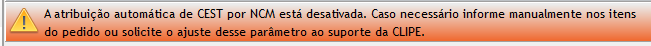 Caso o parâmetro esteja com "Não", um aviso será exibido na tela principal alertando o usuário a preencher manualmente o campo CEST se ele desejar ou fazer contato com o suporte para alterar o parametro: