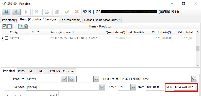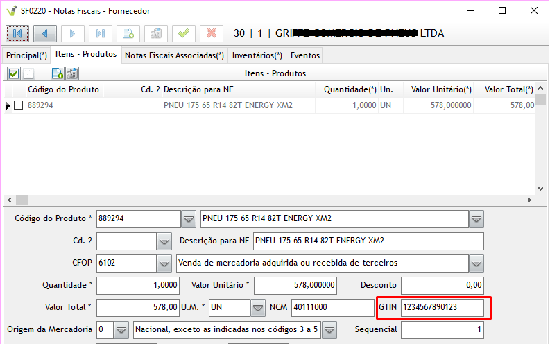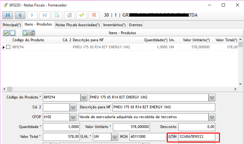 IMPORTANTE: Caso haja necessidade de algum ajuste no código GTIN (EAN), esta alteração pode ser feita no pedido. Se o objetivo é deixar o código em branco, e o retorno foi feito baseado na nota fiscal do fornecedor, deve-se limpar no pedido e no cadastro do produto.